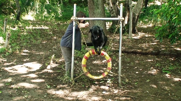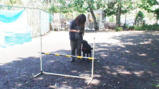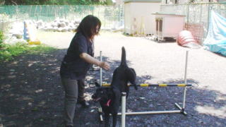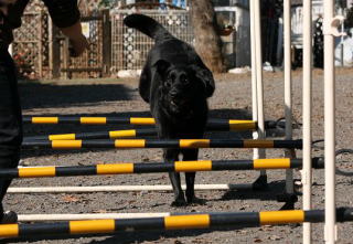 2005年 冬 5連ャンプ ドッグランで遊具を自由に使えるのでメグと練習しました。最初は1連でポールを高くして飛ぶ練習してから次は2連をやってみました。 2連まではすぐにできたのですが、5連は・・・反対側から呼ぶとぐるりとまわってハードルをよけてきてしまいました。 なのでよこから手で呼んで、2連・3連とジョジョに増やして5連もできるようになりました。ただ、1連のときと比べて高さを低くしました。