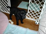 生後43日というと、まだしっかりとは離乳出来てないようでした。 持参のフードをふやかして、子犬用の粉ミルクを混ぜて食事を1日4回に分けて与えました。 来た日から、まずトイレのしつけにかかりきりでした。メグはとても感のいい子でほとんど粗相をすることはありませんでした。完全に意識してシーツへするには3日もかかりませんでした。 完全にサークルの中のシーツが1枚になったころから、1週間たってさらにトイレの場所を部屋にあるケージの中から、徐々にずらして行って、廊下の先のトイレと洗面所の手前に決めました。それも特に問題なくすんなりとクリアーしました。 |