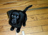 ここはお台所です。 ママが台所へ立つと、決まってするのがこのお座りです。 こんなに小さいころから今もなお同じお座りでママを見上げます。 現在は、「マット」という号令でダイニングキッチンのメグ用のマットへおしりがやっとのる程度に後進して行ってマットの上にお座りします。お料理の間はこのマットの上で伏せをして(勝手に)待っています。 |